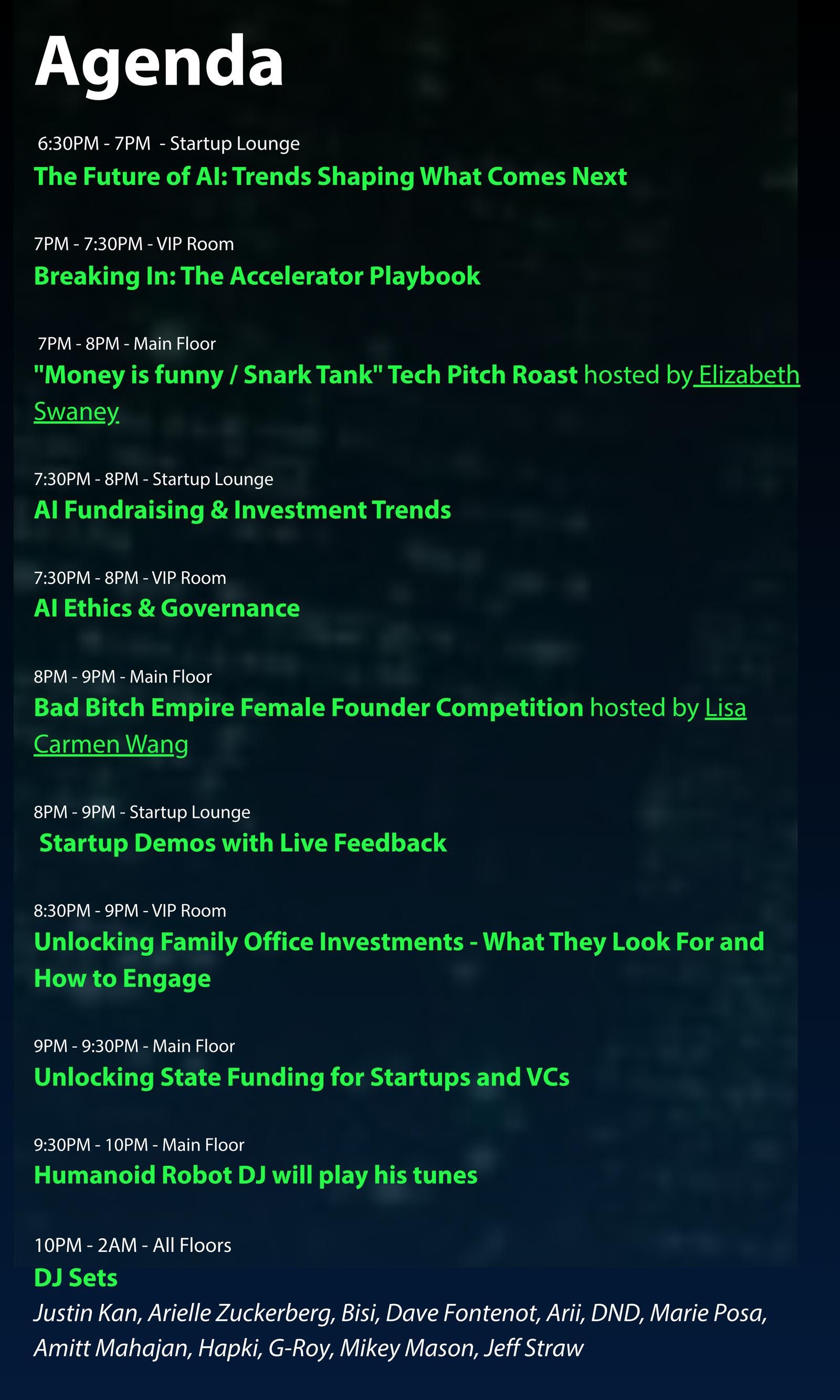 6pm - 9pm: Tech Summit: Panels, Fireside Chats, Demos, Keynotes, and a Comedy Pitch Roast Competition with top-tier investors.